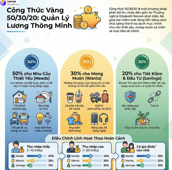 Làm thế nào để quản lý tiền khi lương chỉ ở mức trung bình và cám dỗ chi tiêu thì ở khắp mọi nơi? Bạn cần một công thức đơn giản, dễ nhớ và dễ thực hiện. Đó chính là quy tắc 50/30/20 – tấm bản đồ tài chính "quốc dân" cho bất kỳ ai muốn thoát nghèo.