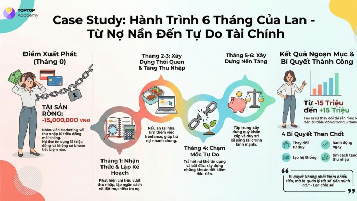 Kết quả ngoạn mục: Sau 6 tháng, từ con số âm 15 triệu, Lan đã có dương 15 triệu trong tài khoản tích lũy. Tổng sự thay đổi tài chính là 30.000.000đ.