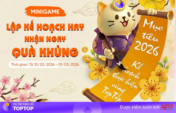 Minigame "Lập kế hoạch hay - Nhận ngay quà khủng" không chỉ là một hoạt động tương tác mà còn là lời cam kết của TopTop trong việc đồng hành cùng Quý khách hàng trên hành trình quản lý tài chính cá nhân. Chúng tôi tin rằng, một mục tiêu rõ ràng kết hợp cùng công cụ tích lũy thông minh sẽ là nền tảng vững chắc cho một năm 2026 thịnh vượng.