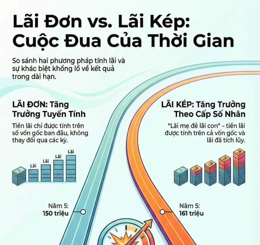 Bạn có bao giờ tự hỏi: Tại sao có người làm việc cả đời vẫn không giàu, trong khi người khác dường như để tiền “tự sinh sôi”?. Câu trả lời không nằm ở may mắn, mà nằm ở một nguyên lý tài chính đơn giản nhưng phi thường: Lãi suất kép.